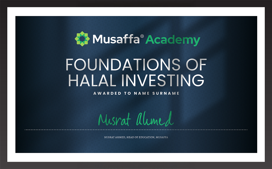 Musaffa Academy is an online learning platform that teaches you how to invest in a halal, ethical, and confident way — from the basics to more advanced topics.