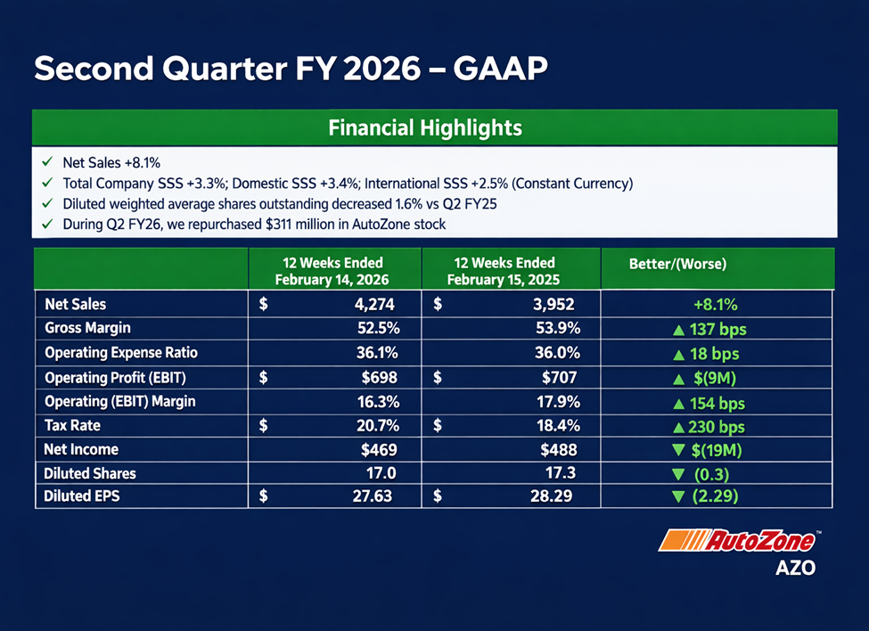 Highlighting the AutoZone Q2 FY26 results, AutoZone's revenue increased, but its profits did not. In Q2 FY26, net sales were $4,274 million, up from $3,952 million in the previous year. Net income was $468.9M compared to $487.9M the previous year, and operating profit was $698.5M (down 1.2% year over year). Diluted EPS was $27.63 as opposed to $28.29 in the previous year.