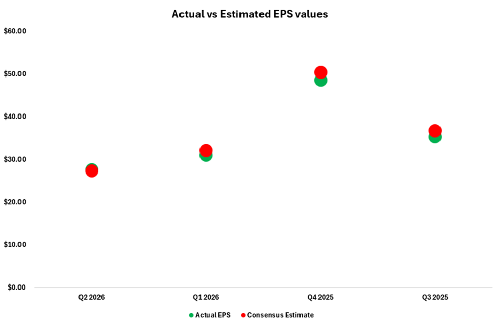 The results did not meet expectations. While non-GAAP EPS was $27.63 vs $27.17 predicted (a beat), revenue was $4.27 billion as opposed to $4.31 billion as anticipated (a slight miss).