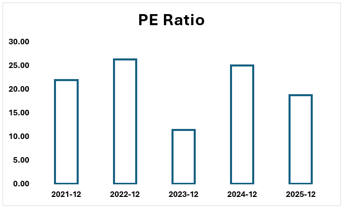 The P/E Ratio figures of 2021 to 2025 show how investors and the market have changed their attitude towards Johnson and Johnson and its valuation in its restructuring of corporate activities. The ratio that indicates the amount of money that the market is willing to pay per dollar of the company’s earnings is very volatile because of the huge one-off accounting events that have taken place over the past several years.
