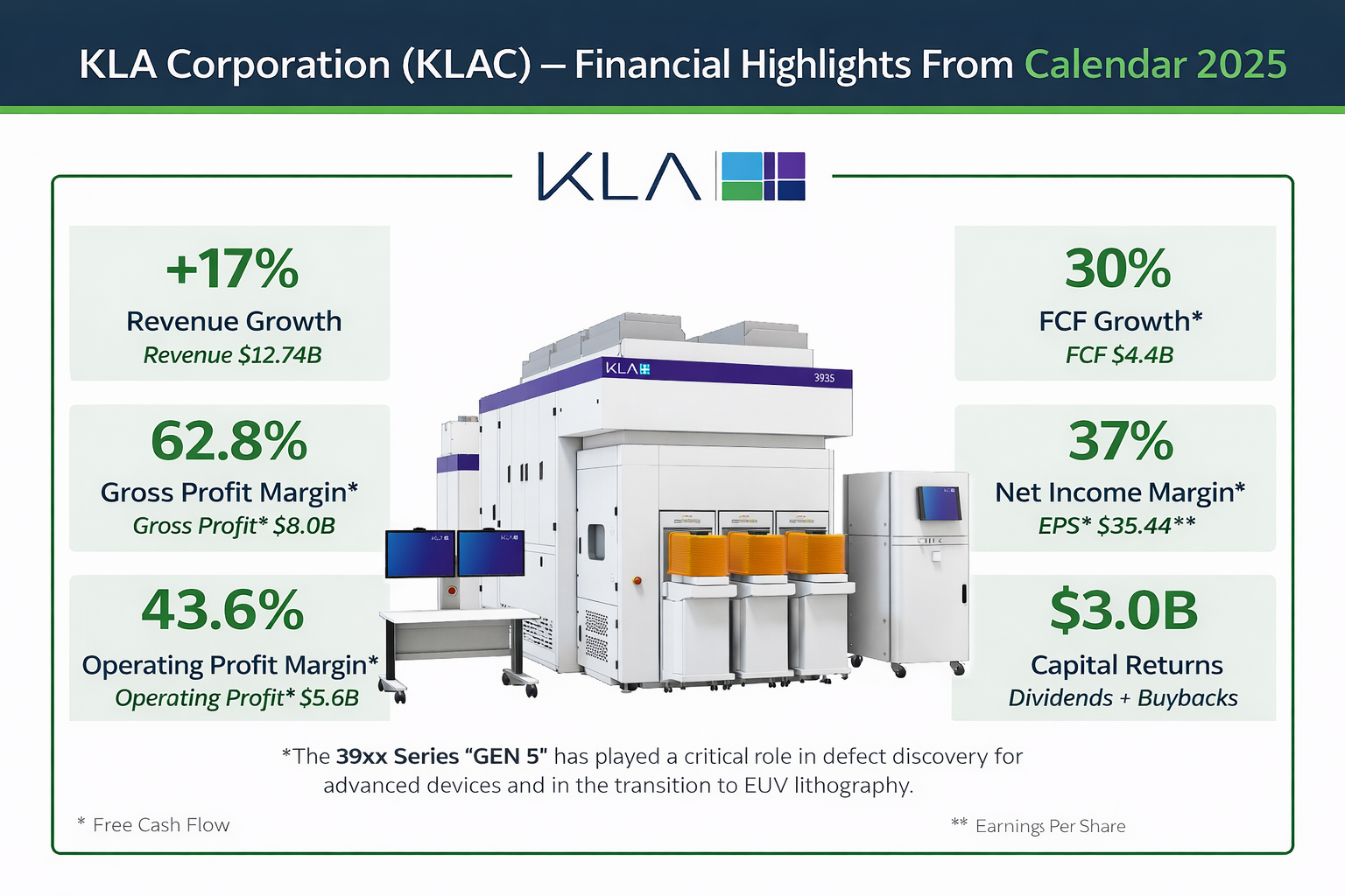 KLA is a semiconductor equipment firm that primarily assists chipmakers in measuring, inspecting, and improving the production of sophisticated devices. That may sound scientific, but the business is fairly simple to understand: KLA makes a lot of money because manufacturers require better control tools as chip production becomes more sophisticated. The most significant aspect of the narrative at the moment is the growing demand for better process control in the manufacturing of AI-related chips, particularly in foundry, logic, memory, advanced packaging, and services.