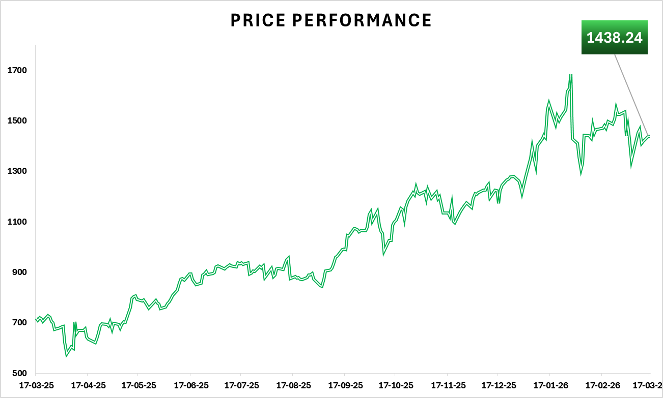 The shares are well above the 52-week low of $551.33 but still below the 52-week high of $1,693.35. 954,922 shares were traded, slightly below the 20-day average of 1,091,012. So there is no sign here of unusual panic or euphoria in the most recent session.