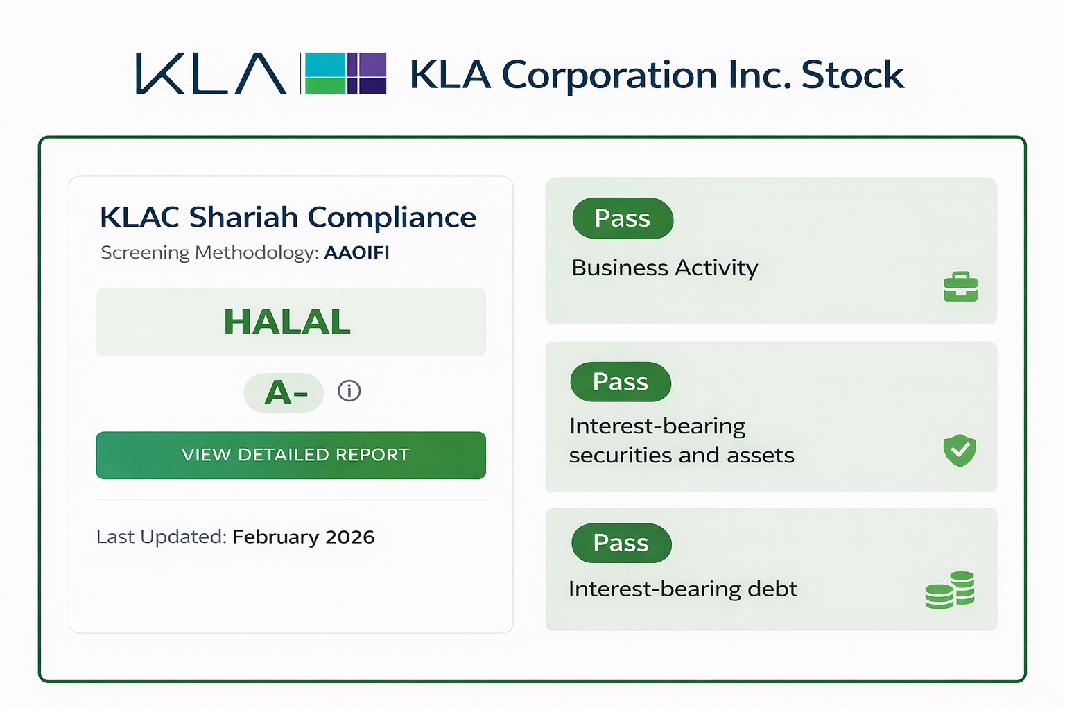For investors reviewing Shariah-compliant stocks KLAC, as of February 2026, KLA (KLAC) is classified as Shariah-compliant (Halal) with an A- Musaffa rating based on the Shariah Screening results at Musaffa. KLAC’s 2026 2nd Quarter Report was used to conduct the screening analysis in line with the AAOIFI methodology. KLAC passed all three required screening thresholds, with 98.83% of its business activity meeting the permissible (Halal) threshold (0.00% doubtful and 1.17% not Halal). Both interest-bearing securities (5.79%) and interest-bearing debt (6.13%) remain below 30% of the 36-month average market capitalization.