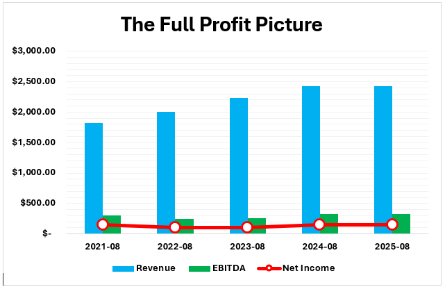 These same pressures were also observed in net income, along with increased merchandise, payroll and energy expenses in the post-pandemic inflationary period. The financial situation of the company has stabilized by fiscal 2024 and 2025, with net income going back to the range of $145 million to 148 million and EBITDA going over 324 million. This recovery was assisted by the successful acquisition integration such as Clean Uniform in 2023 and better operating leverage as the most intense spending of their technology programs started to lessen (UniFirst).