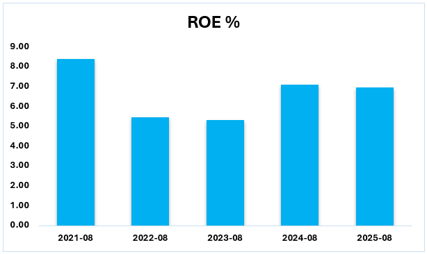 The Return on Equity (ROE) of UniFirst stock varied during the years 2021-2025 and this indicates that the company was undergoing an intensive internal investment that strained the returns to the shareholders in the short term. High operating costs associated with the multi-year digital transformation and the overhaul of the ERP system of the company caused the decrease in the percentage of 8.36 in 2021 to a low of 5.29 in 2023. ROE has rebounded by 2024 and 2025 to the 7% range as this technology investment has started to stabilize and newer acquisitions have begun to add to the bottom line. Although this is recovering, the metric is still lower than the industry peers because UniFirst has a debt free balance sheet with high equity levels, which of course dilutes the ROE computation.