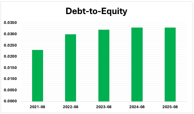 UniFirst Corporation has a highly conservative capital structure due to its Debt-to-Equity ratio that was consistently lower than 0.04 in 2021-2025. This insignificant amount of debt shows that the company funds its operations and multi-year digital transformation practically only out of internal cash flow and shareholder equity and not with the help of external borrowing. Although there was a slight improvement in the ratio between 0.023 in 2021 to 0.033 in 2025, it is still very low compared to industry averages, as the company has a very low-risk financial profile before its merger with Cintas in 2026.