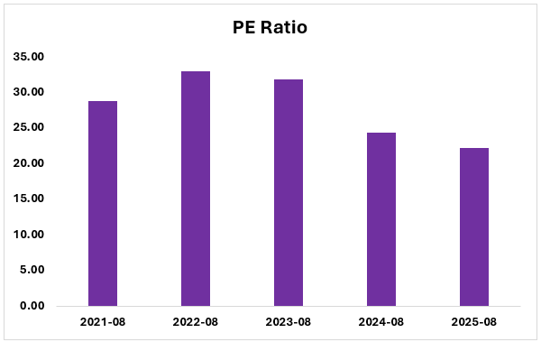 Prices to earnings (P/E) ratio of UniFirst Corporation has also undergone a discernible contraction during the period 2021-25 and this represents a drastic change in the market valuation. The ratio reached a peak of 33.01 in 2022 and has consistently decreased to 22.28 by 2025, which means that the investors have started to spend less on every dollar of the company earnings. This pattern is probably a shift away to a growth-at-any-cost valuation at the height of the company spending on digital transformation to a more value-based one as the merger of Cintas and the company in 2026 neared.